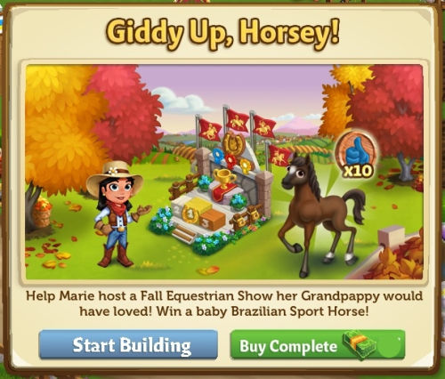 Marie has got great news from this year’s Conference of Mayors. We’re going to host this year’s Fall Equestrian Show! Marie needs your help in hosting the event so build an Equestrian Center on your farm. For your effort!, you’ll receive a baby Brazilian Horse!
